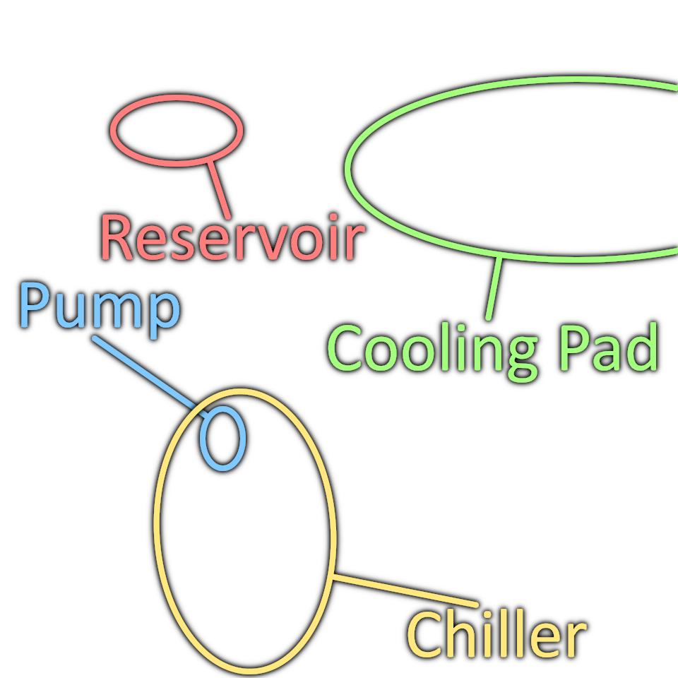 - Place the chiller, cooling pad (plastic face upward), reservoir (oriented horizontally), and pump in your planned locations. The reservoir in particular must be at the loop's highest point, as its role is to collect trapped air while the coolant cycles.